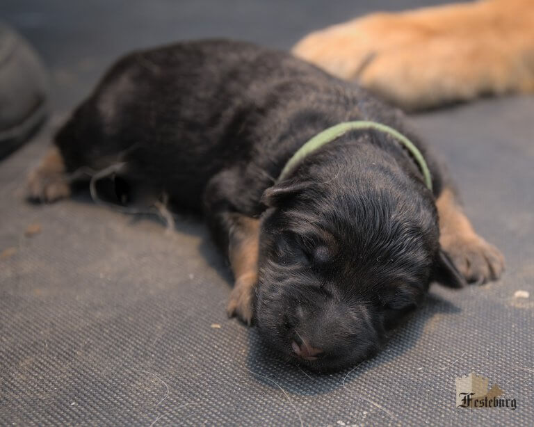 At 11:30, Annora started barking and whining, which woke me up. Thinking that she might just need to go outside to do her business, I headed downstairs to the puppy room expecting to be able to go back to bed shortly. I quickly realized, though, that she had transitioned into active labour. I scrambled into action and got all my essentials nearby and handy. Shortly after midnight, the first puppy , a female, was born. It was now March 17th, Saint Patrick’s Day, so naturally she had to have a green collar! 🙂